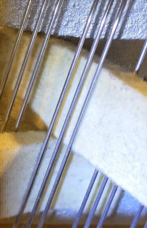 Image ci‑dessus : L’accordeur de piano étouffe les deux cordes extérieures d’un chœur à l’aide de deux coins en feutre afin d’accorder la corde centrale avec précision.